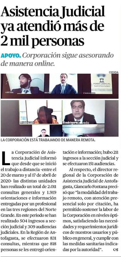 [Prensa] Más de 2 mil atenciones ha realizado la Corporación de Asistencia Judicial en las regiones de Arica y Parinacota, Tarapacá y Antofagasta durante las primeras cuatro semanas de la emergencia sanitaria.