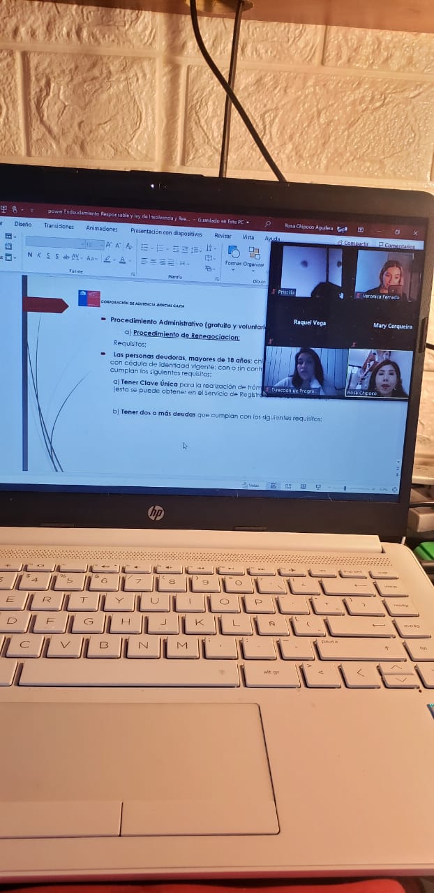 La Abogada Coordinadora (S) del Consultorio Jurídico de Alto Hospicio, Rosa Chipoco Aguilera junto a la Asistente Social, Verónica Ferrada Donoso realizaron una jordana de capacitación por videoconferencia, sobre "El endeudamiento de las personas naturales y las soluciones propuestas por la ley 20.720 de Insolvencia y reemprendimiento", destinado a dueñas de casa, trabajadoras y futuras emprendedoras agrupadas a través del PRODEMU.