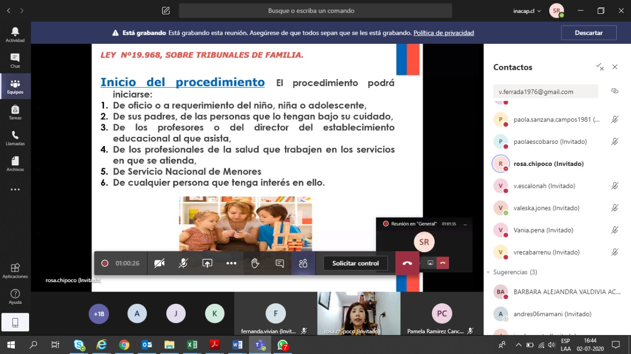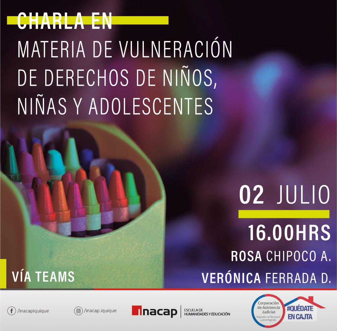 El Consultorio JurÃdico de Alto Hospicio llevó adelante este jueves 2 de julio, una completa charla de capacitación sobre vulneración de derechos a niños, niñas y adolescentes, dirigida a la Escuela de Humanidades y Educación de la Universidad Tecnológica de Chile, INACAP.