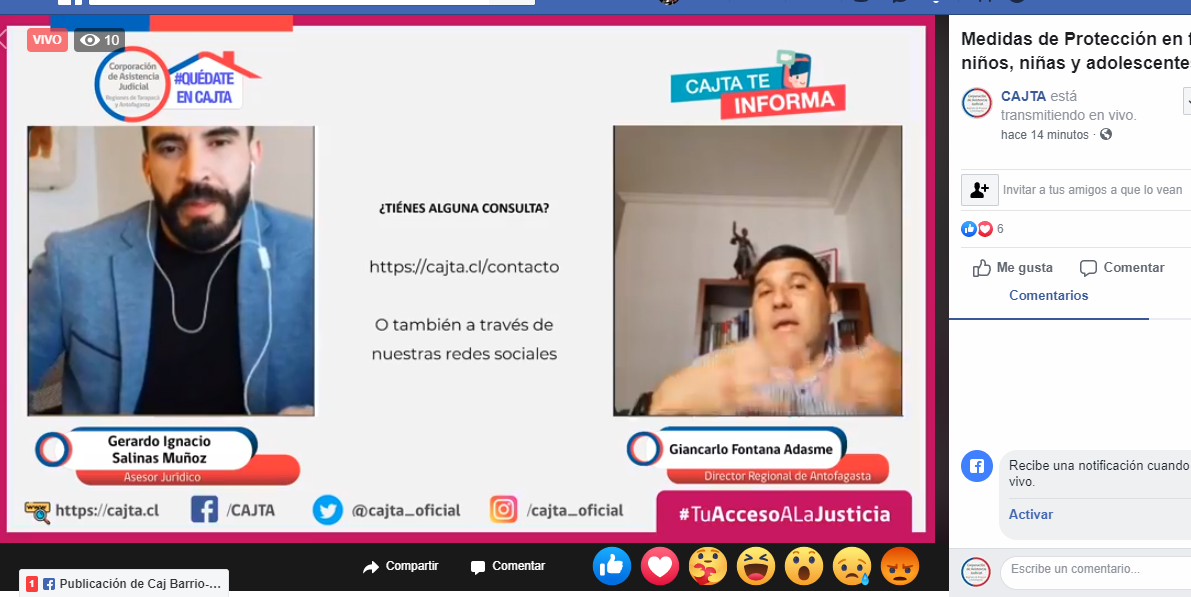 En la ocasión, el Asesor JurÃdico de la Corporación Gerardo Salinas Muñoz mantuvo un interesante diálogo de carácter informativo con el Director Regional de Antofagasta, Giancarlo Fontana Adasme. Los profesionales, informaron a la comunidad sobre la Corporaciones de Asistencia Judicial, de la asesorÃa que ellas entregan con la finalidad de brindar acceso a la justicia a todas las personas vulnerables.