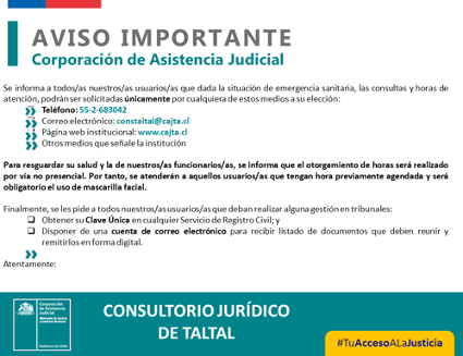 En la ocasión se converso respecto del funcionamiento de la unidad jurÃdica de Taltal y del Tribunal en tiempo de pandemia, se realizó difusión de la Solución colaborativa de Conflictos y Mediación, materias sujetas a dicha técnica y en que consiste el proceso. Ademas de Informar horario de atención presencial y forma de agendamiento de hora entre otros.