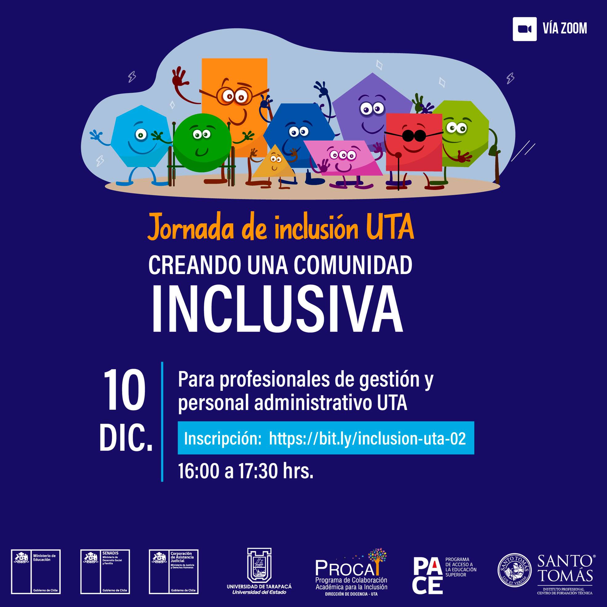 En dichas actividades también expusieron la Directora Académica CFTIP de la Universidad Santo Tomás, la Sra. Marcela Valenzuela que trató sobre las “Estrategias para el abordaje del aprendizaje inclusivo en educación superior”, y los profesionales PACE del área de Formación Integral de la Dirección de Docencia de la UTA, el Sr. Pablo Ampuero y la Sra. Valentina Buccioni abarcando los “Elementos para construir comunidad UTAína Inclusiva”, además de la participación del académico y abogado de la carrera de derecho el Sr. Sergio Pérez quien reflexionó sobre su experiencia como alumno y académico con discapacidad en la Universidad.