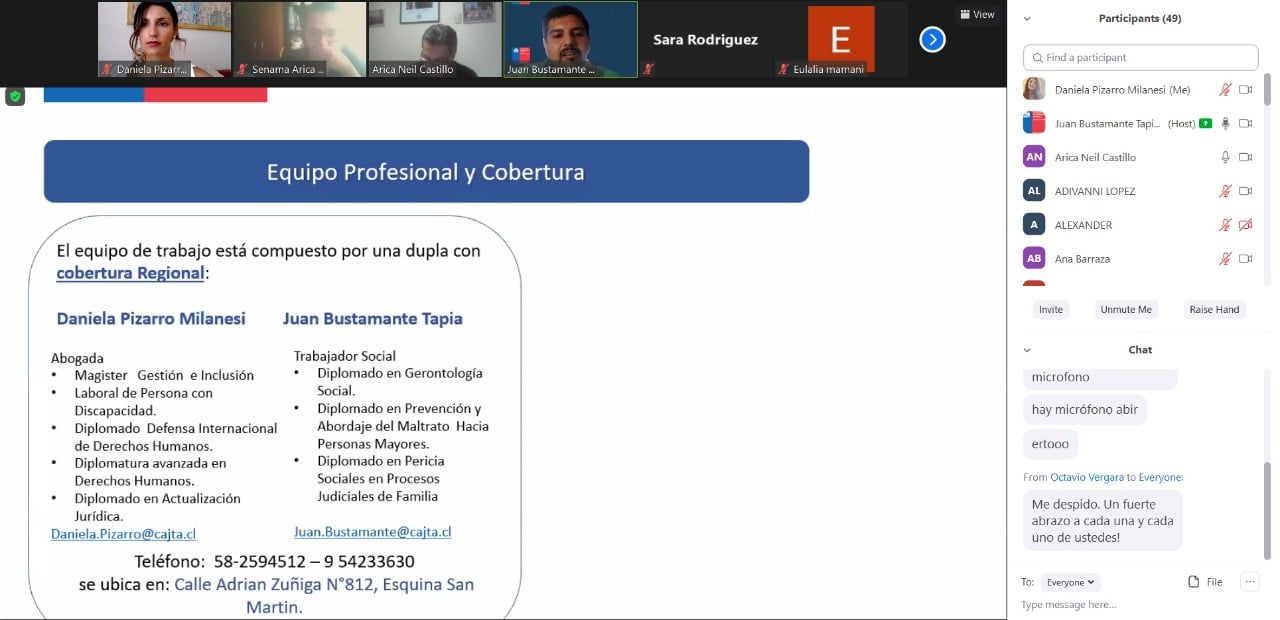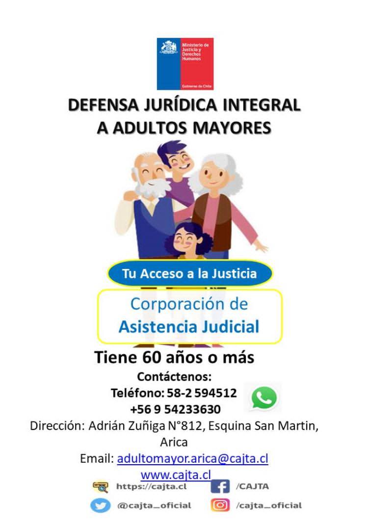 El dÃa 16 de diciembre el Programa de Defensa JurÃdica integral al Adulto Mayor junto al Programa de Acceso a la justicia para personas con discapacidad del convenio CAJTA-SENADIS y la Asistente Social del Consultorio JurÃdico de Arica, participaron en la segunda capacitación con dirigentes mayores convocada por Senama.