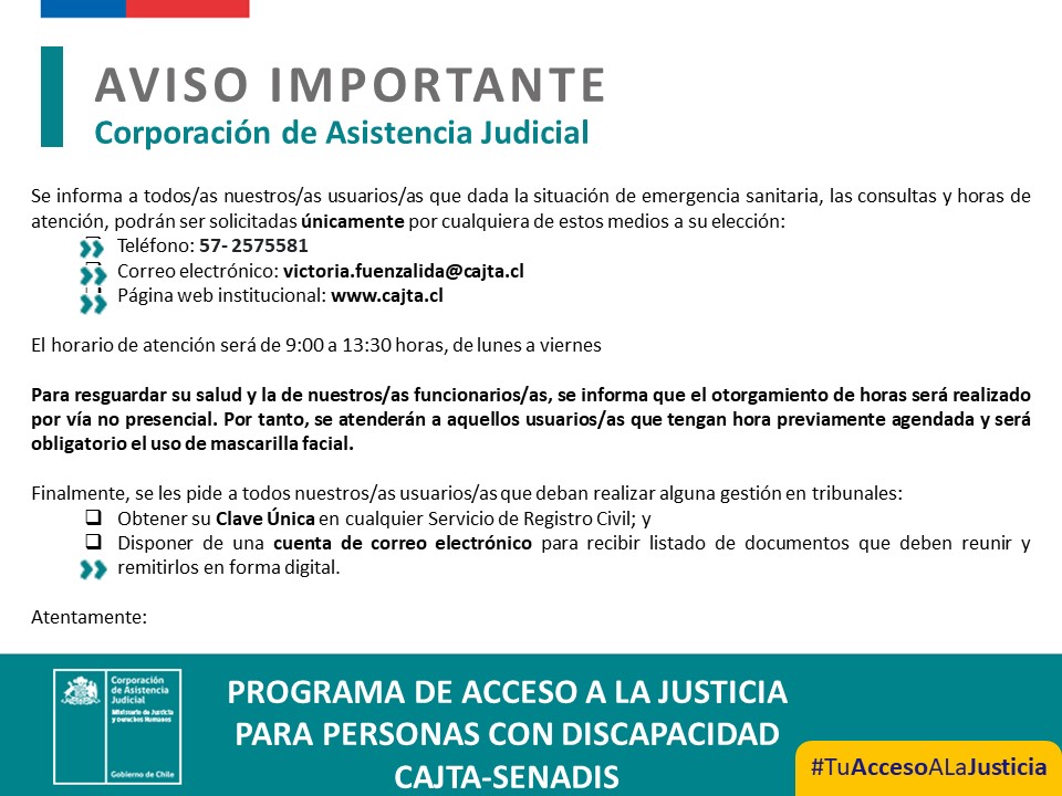 Por la Corporación participaron la Abogada del Convenio CAJTA-SENADIS, Victoria Fuenzalida y la Trabajadora Social de la unidad Defensa Juridica Integral a Adultos Mayores, Carolina Opazo Estay, junto al apoyo del Conductor Mauricio Zuñiga del Campo.