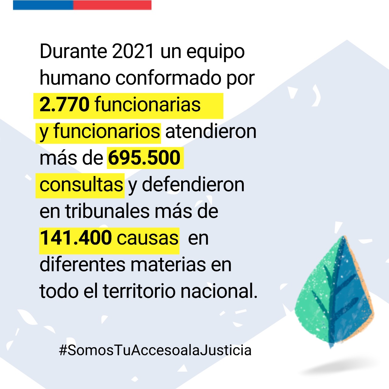 Durante 2021 un equipo humano conformado por 2.770 funcionarias y funcionarios atendieron más de 695.500 consultas y defendieron en tribunales más de 141.400 causas en diferentes materias en todo el territorio nacional.