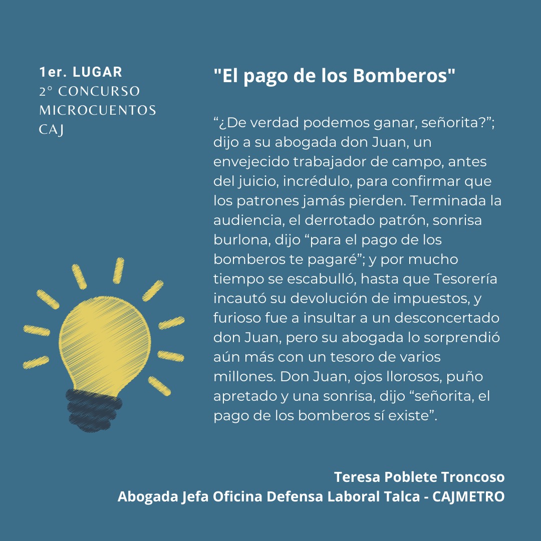 Primer lugar: “El pago de los bomberos” de Teresa Poblete Troncoso, Abogada Jefa de la Oficina de Defensa Laboral de Talca de CAJMETRO.