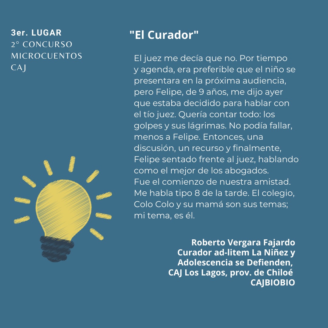 Tercer lugar: “El Curador” de Roberto Vergara Fajardo, Curador ad Litem de la línea de representación especializada “La Niñez y Adolescencia se Defienden”, CAJ de Los Lagos, provincia de Chiloé de CAJBIOBIO